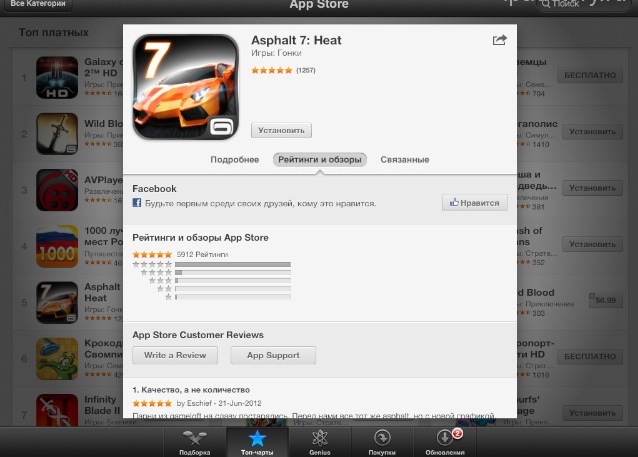 Очень удобной стала после переработки вкладка Топ-чарты в iOS 6. Сразу подгружается 100 приложений в каждом из разделов. Всего, как и раньше, три раздела: