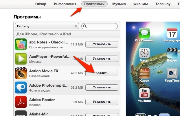 Нажимаем по iPad. И переходим во вкладку программы. Там будет список, в котором находим ненужную программу и жмём кнопку «Удалить» (прим. автора: в iTunes версии меньше 11 вместо кнопок галочки).