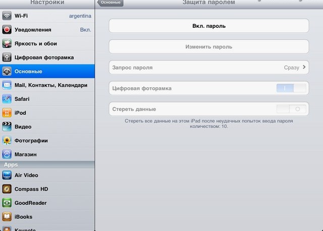 UPDATE: В новых прошивках iPad внедрен наконец сложный пароль на iPad. Включается он просто — в Настройки -> Основные есть ползунок Простой пароль. Переводим его в положение «Выкл».