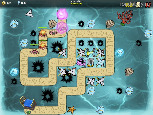 В-третьих, карты в The Creeps HD изначально испещрены различными штуками (деревья, камни, пруды), взорвав которые мы получаем бонусы, но чтобы взорвать надо отвлекаться от движущихся угроз, да и эти бонусы порой стоят очень неудобно. Это добавляет в игру элемент стратегии в стратегии: то есть нужно не только оборону вести, но и по возможности вычищать поле от всякого шлака.