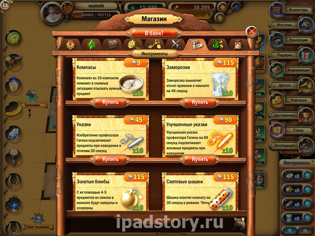 Однако, не это является минусом игры. Мне, например, не понравилось, что цены на предметы периодически меняются (без всяких оповещений). Я привыкла покупать указки (инструмент для поиска в комнатах) за золото, а после обновления они вдруг резко подорожали… Теперь инструменты можно купить только за кристаллики.