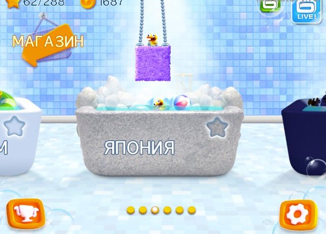 В игре у нас есть рыбка (рыбки с каждым новым паком уровней меняются), которой необходимо скушать всех уточек. По пути необходимо собрать монетки, которые щедро разбросаны по уровню. Оттягиваем рыбку, как птичку в Angry Birds — отпускаем и она летит, плывет, кушает по той траектории, которую ей подскажут законы физики.
