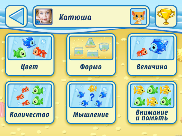 Потом вниманию вашего чада представлено главное меню с мини-играми, и развивающим блокам. Это цвет, форма, величина, количество, мышление, внимание и память.