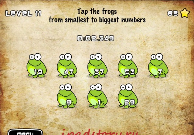 Level 11: Трогайте лягушек поочередно в зависимости от цифр в порядке возрастания (мой рекорд 5383 ms)