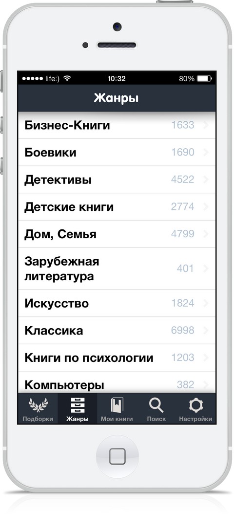 Приложение очень просто в использовании. В разделе — «Подборки» вы найдете лучшие книги, экранизированные в текущем году, сборки бестселлеров по жанрам или писателям и т.д.