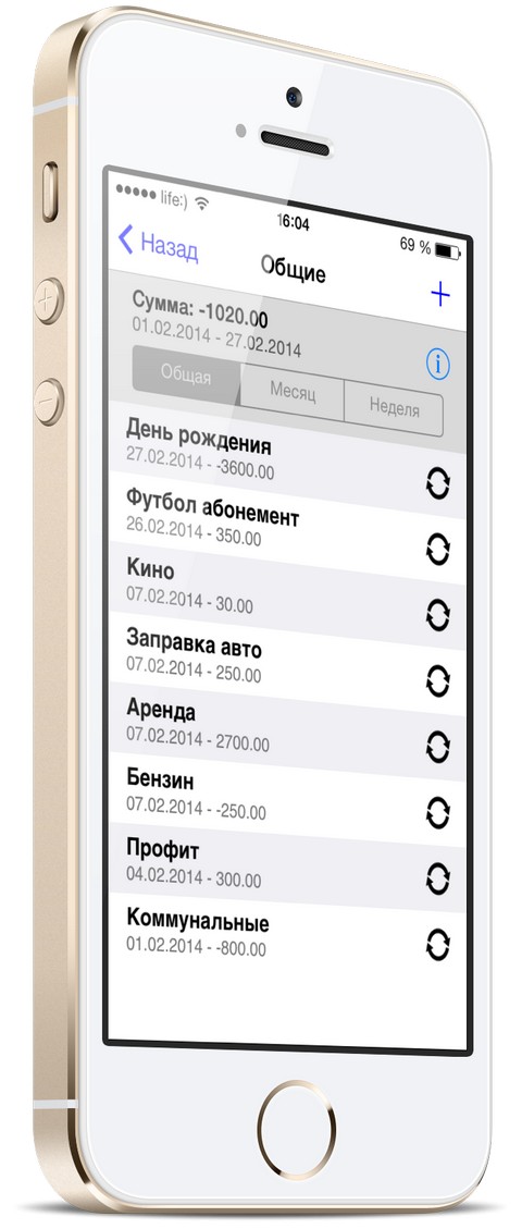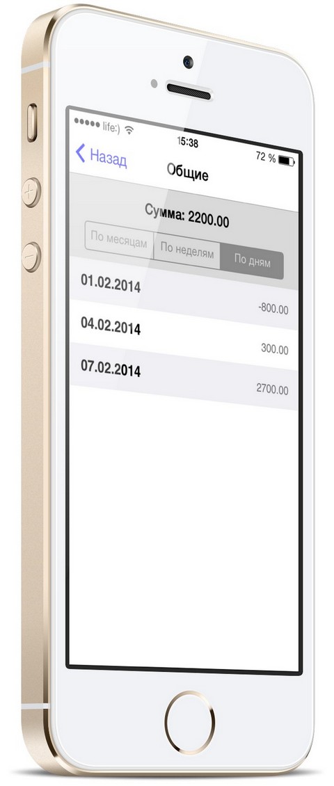 В графе «Сумма» нужно вводить лишь числа. Одно исключение – это знак «-» (минус). В подобном варианте приложение будет считать текущий баланс и выводить его возле названия раздела в главном меню и внутри раздела в режиме автомат. Хорошо, что соблюдается хронология ведения заметок. Существует возможность выведения записи по дням, неделям или месяцам. Это можно сделать кликнув на иконке «i» в верхней части раздела.
